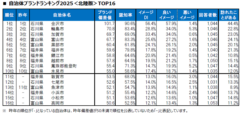 <北陸版>の1位に輝いたのは、石川県・金沢市。ブランド偏差値は101.7と、2位以下を大きく引き離す結果となっている。そのほか、2位には石川県・輪島市(70.8)、3位には石川県・加賀市(69.7)、4位には富山県・富山市(67.7)、5位には富山県・黒部市(60.4)がランクイン。なお、5位までは、昨年と全く同じ順位となっている。