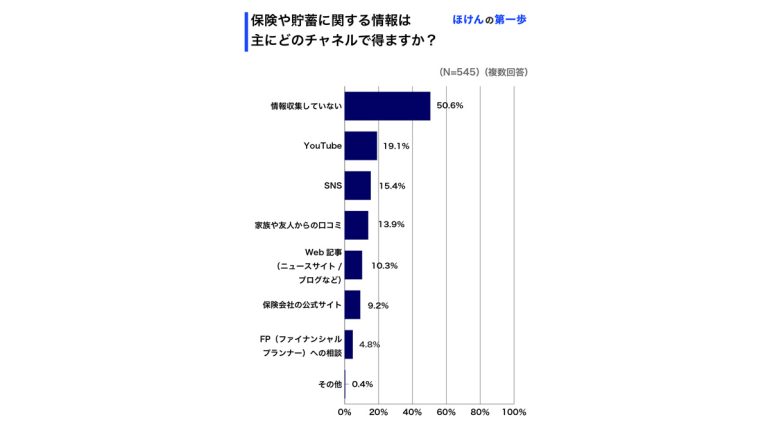 Z世代の主な情報源を調査すると、50.6%は保険について情報収集をしていなかった。情報収集をしている場合の主な情報源は、1位が『YouTube』、2位がSNS、3位が家族や友人からの口コミだった。保険相談窓口や専門家への相談よりもデジタルメディアを通じた情報収集が主流で、Z世代は複数の情報源を比較して自分に合った選択をしたい傾向があるので、多様な視点や口コミをインターネットで確認してから判断したいようだ。保険の専門家に対しては、信頼できると感じていても相談するのはハードルが高いと感じていそうだ。