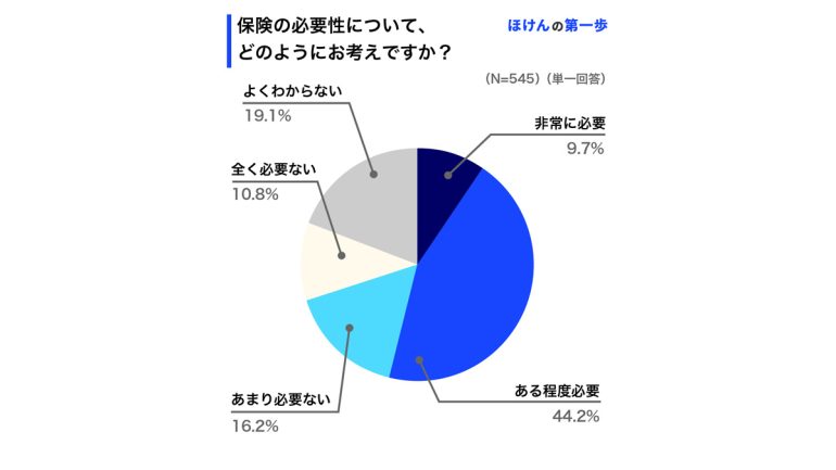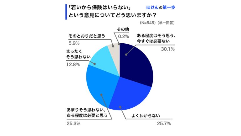 さらに「若いから保険はいらない」と考えているか質問すると、「そのとおりだと思う」と「ある程度はそう思う、今すぐは必要ない」の合計は36.0%だった。「あまりそう思わない、ある程度は必要と思う」と「まったくそう思わない」の合計が38.1%で意見は拮抗していた。若いうちは保険の必要性を感じていない層は存在しているようだ。