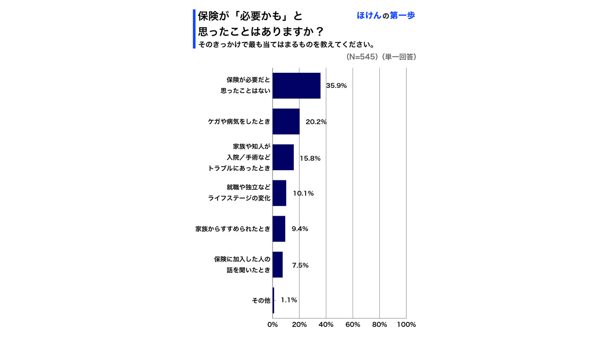 「保険不要論」の意見としては、「若いから保険がなくても大丈夫」といったものがある。そこで保険未加入者に対して、「保険が必要かも」と考えたことがあるかを質問すると、約64%が必要かもしれないと思ったことがあると回答した。理由は「ケガや病気をしたとき」や「家族や知人が入院・手術などのトラブルにあったとき」がもっとも多く、実際のリスクに直面した時に保険の必要性を感じている。Z世代も根本的に保険が不要と考えているわけではなく、リスクを実感する機会があれば保険の必要性を感じているようだ。
