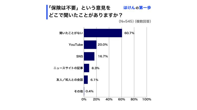 Z世代が保険は不要という意見をどこで知ったか調査すると、「聞いたことがない」が60%以上と多数派だった。それに『YouTube』やSNSが続いた。Z世代は保険についてさほど情報収集をせず、保険不要論についても知らない人が多いようだ。SNSで散見されるZ世代の保険不要論は、少数意見で影響力も少ないといえそうだ。アンケートの結果を分析すると、保険そのものに否定的というよりも「よくわからない」、「コスパが悪そう」という印象から距離を置いている人が多いことが推測される。保険不要論が支持されているというよりも、正しく理解していないので選択を回避しているということだろう。