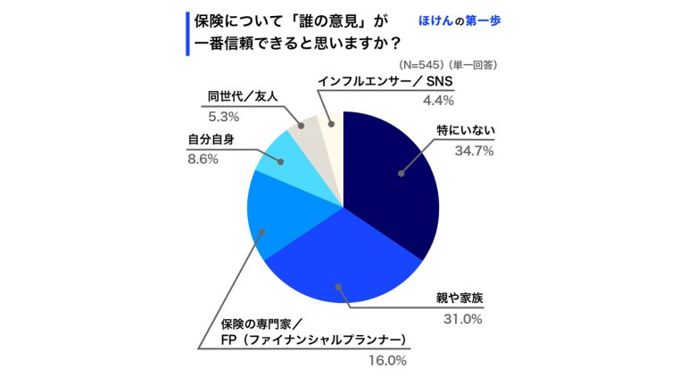 Z世代が保険について考えるときに、誰の意見をもっとも信頼するかについては、1位は「特にいない」(34.7%)、2位は「親や家族」(31.0%)、3位は「保険の専門家(ファイナンシャルプランナー、保険会社)」(16.0%)というランキングだった。「特にいない」と回答した人以外では、親や家族など身近な人の意見を参考にすることが多いようだ。ちなみにインフルエンサーやSNSを信頼すると回答した人は4.4%しかいなかった。