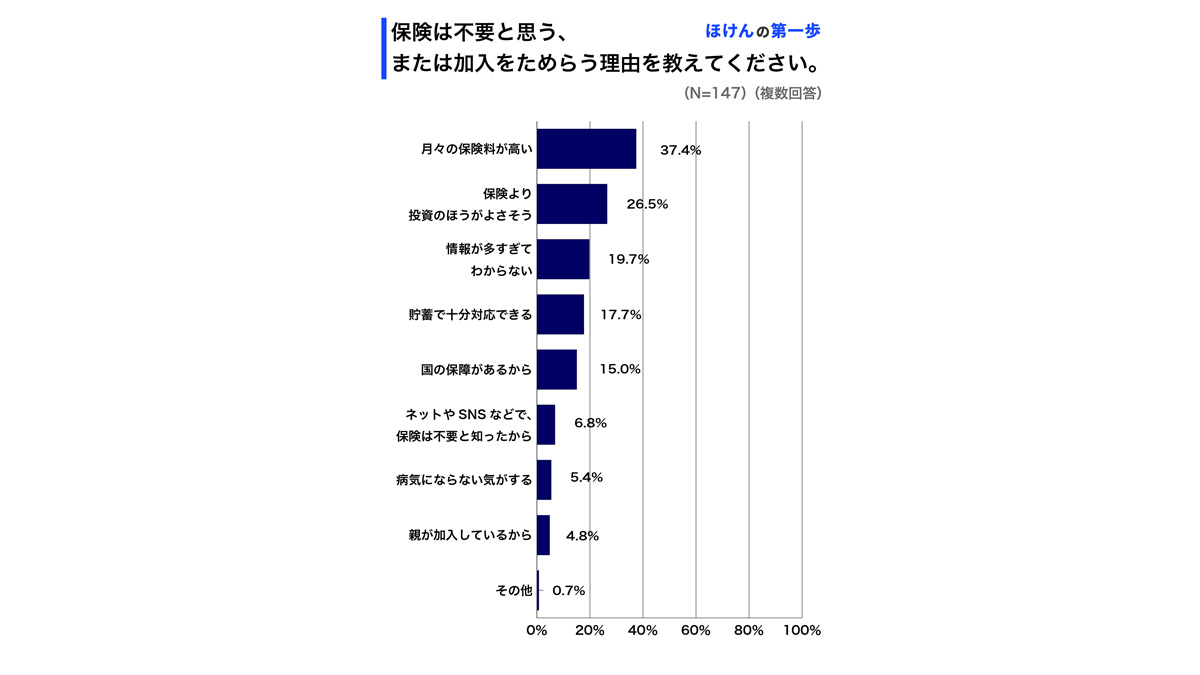 Z世代が保険は不要と考える、あるいは加入をためらう理由では、1位は「月々の保険料が高い」、2位は「保険より投資の方がよさそう」、3位は「情報が多すぎてわからない」というランキングになった。Z世代はコスパ志向が高いと言われており、保険の検討でも投資などの選択肢と比較検討してコスパを考えて判断しているようだ。4位以下には「国の保障があるから」や「貯蓄で十分対応できるから」といった回答があり、民間の保険の必要性を感じていない層も一定数いた。