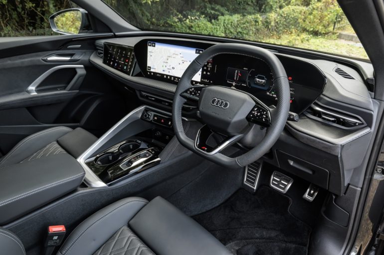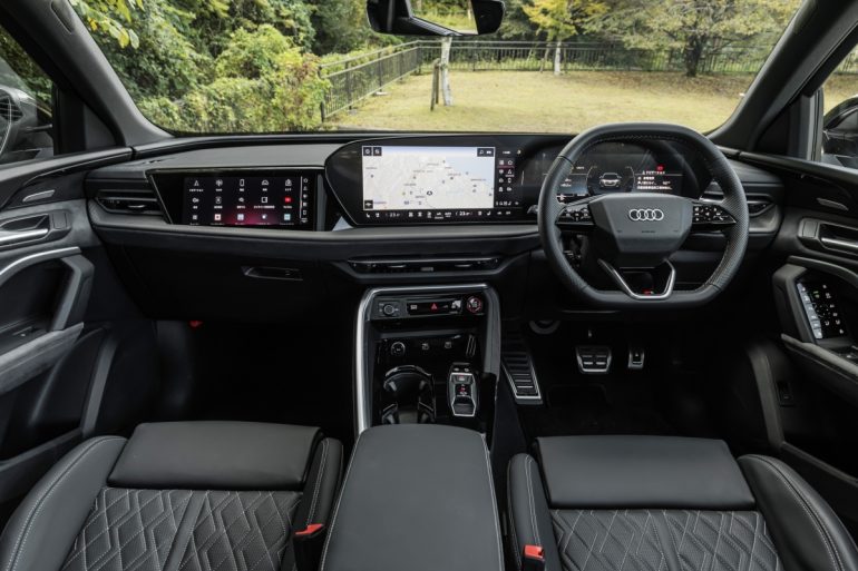 運転席に乗り込めば、A5でも採用されているデジタルステージと呼ぶ曲面OLEDテクノロジーを備えた11.9インチのアウディバーチャルコックピットと14.5インチのMMI タッチディスプレイによるMMIパノラマディスプレイが目を引く。見ての通り、ダッシュボード一面がディスプレイとなり、助手席にまで広がったディスプレイはナビ設定などでドライバーを助手席側からもサポートできるシステムだ。これなら助手席の乗員もドライブをより楽しめるに違いない。