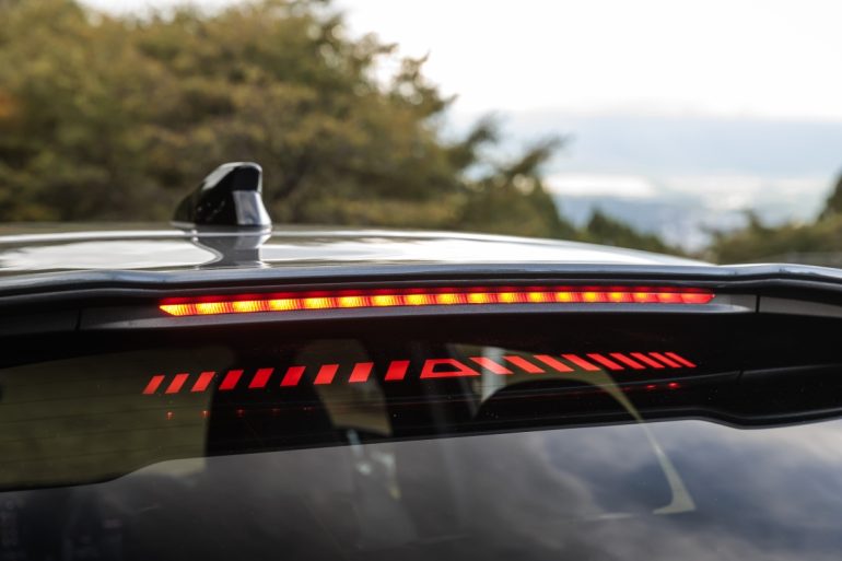 SQ5スポーツバックのエクステリアはまさにプレミアムミッドサイズSUVらしいスタイリッシュで筋肉質な堂々感とスポーツテイストに溢れている。ユニークなのは、アウディ初採用のリヤウインドウプロジェクションライトだ。リヤウインドウ上部のルーフスポイラーにあるブレーキライトをリヤウインドウ面に投影し、ハイマウントブレーキライトの面積を広げてくれるという、後続車からの安全性を一段と高めてくれる新技術である。