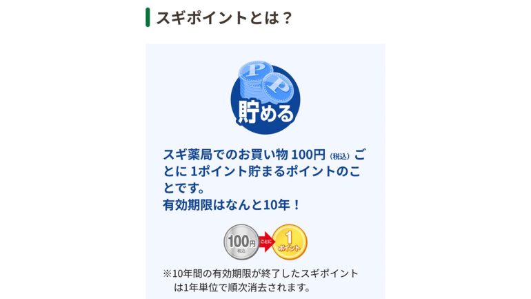 スギ薬局ではお会計の際にポイントカードを提示すると100円(税込)につき1スギポイントが貯まります。