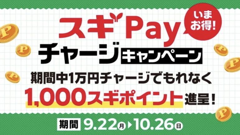 キャンペーン期間中に累計10,000円以上チャージすると、1,000スギポイントがプレゼントされます。