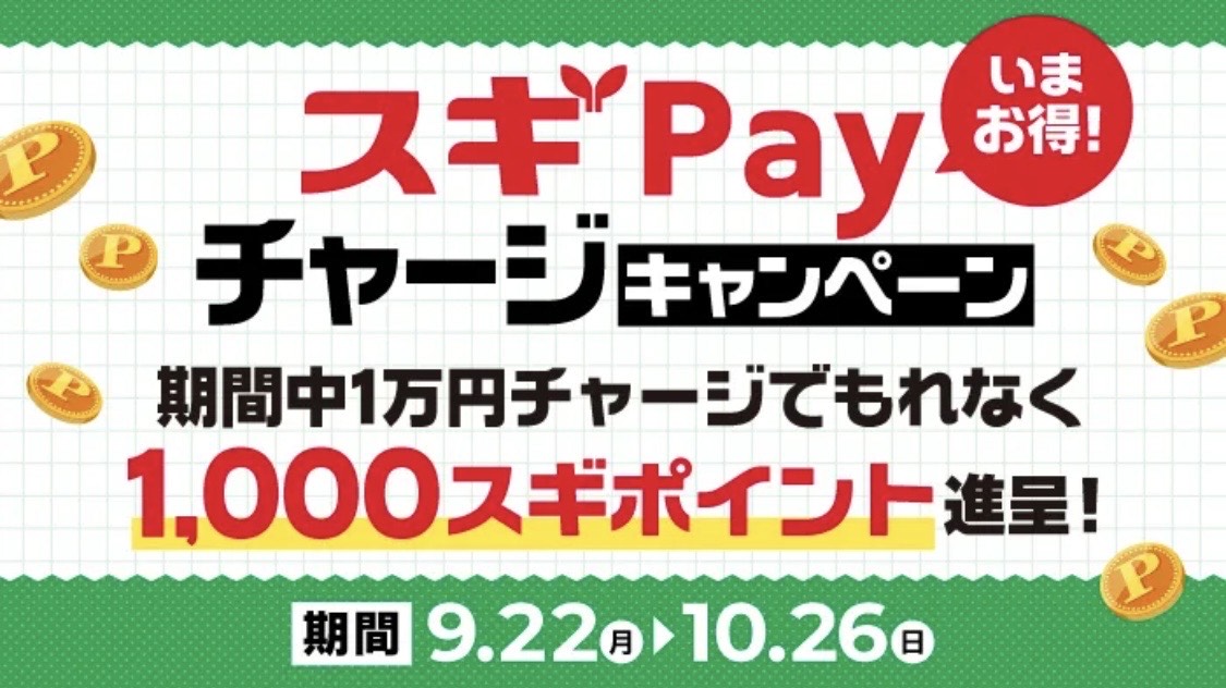 キャンペーン期間中に累計10,000円以上チャージすると、1,000スギポイントがプレゼントされます。