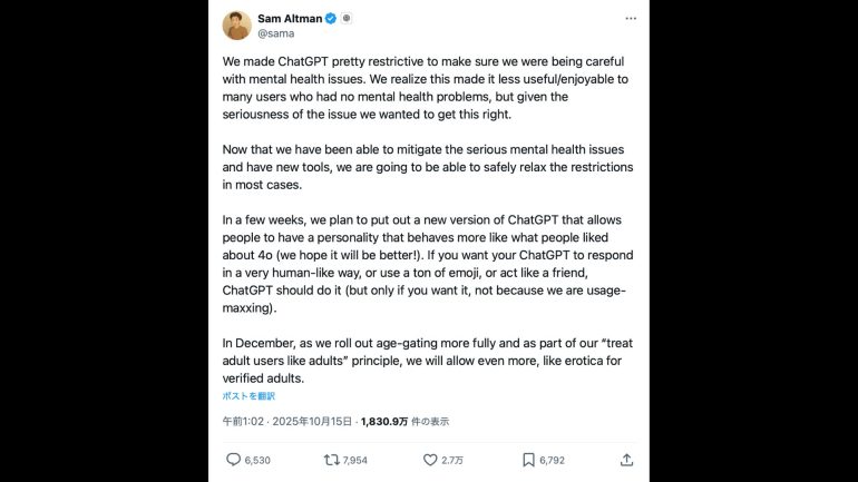 しかし、それ以上に話題を集めたのがポストの後半「In December, as we roll out age-gating more fully and as part of our “treat adult users like adults” principle, we will allow even more, like erotica for verified adults.」(12月には、年齢認証を本格的に導入し、『成人ユーザーを大人として扱う』という原則の一環として、認証済みの成人向けにエロティカも許可する予定です)だ。