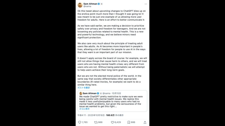 年齢確認をすればアダルトコンテンツが解禁されるとも読み取れる内容だ。あまりの反響の多さに、アルトマンCEOは翌日、次のように補足している。