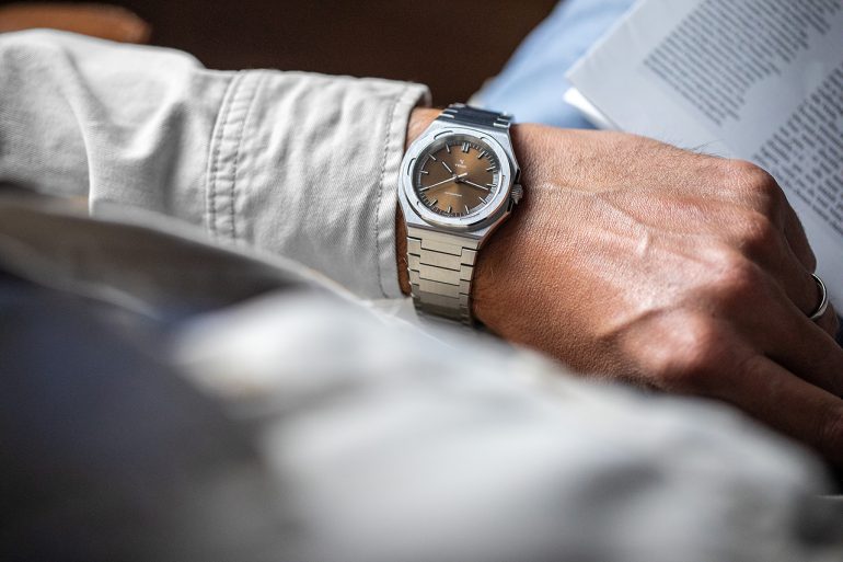 都会的なデザインとスポーツエレガンスを融合。サンレイ仕上げのダイヤルと統合型ブレスレットが上品で現代的な印象を与える。