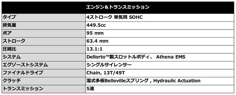 エンジンマッピングは、先行デビューしている限定の450-RCエディションから継承し、スロットルレスポンスと低回転域トルクを強化。レース用の強大なトルクをコントロールし、コーナーからの脱出やスタートでの競争力を高めている。