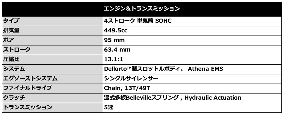 エンジンマッピングは、先行デビューしている限定の450-RCエディションから継承し、スロットルレスポンスと低回転域トルクを強化。レース用の強大なトルクをコントロールし、コーナーからの脱出やスタートでの競争力を高めている。