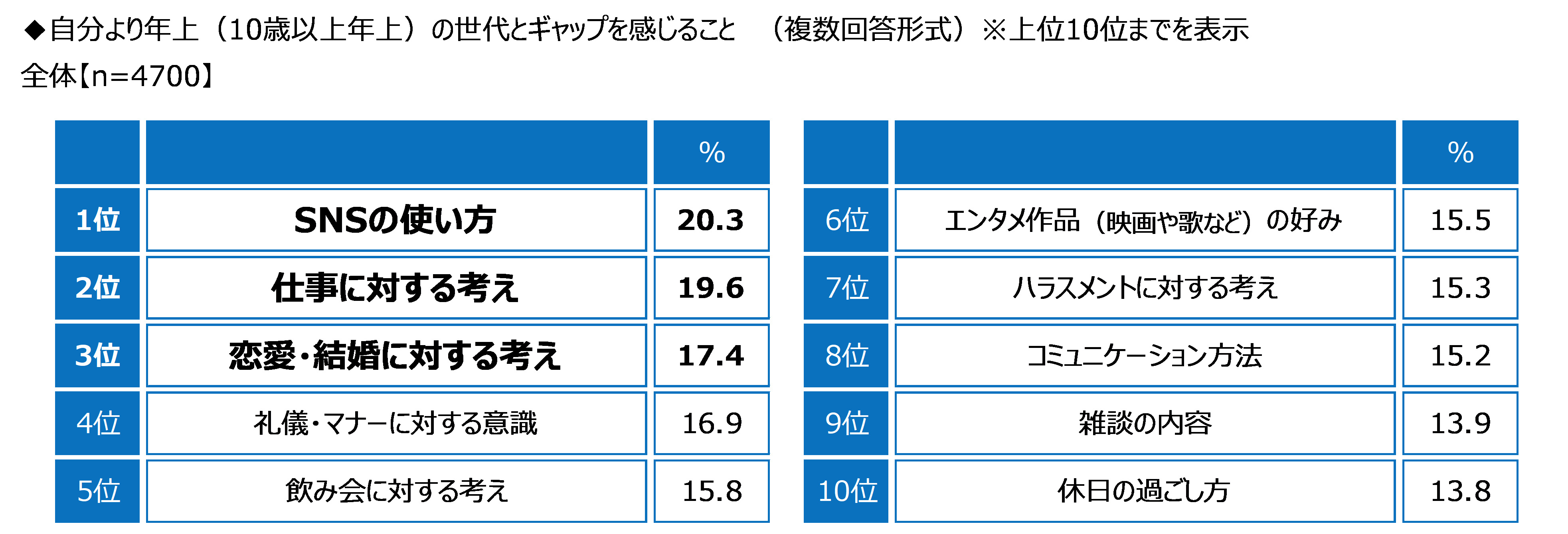自分より年上(10歳以上年上)の世代とギャップを感じることを聞いたところ、「SNSの使い方」(20.3%)が最も高くなった。次いで、「仕事に対する考え」(19.6%)、「恋愛・結婚に対する考え」(17.4%)、「礼儀・マナーに対する意識」(16.9%)、「飲み会に対する考え」(15.8%)となった。