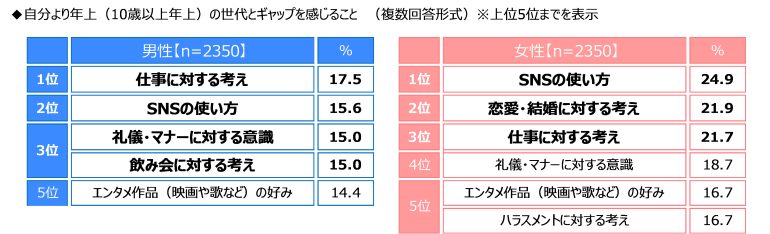 男女別にみると、男性では1位「仕事に対する考え」(17.5%)、2位「SNSの使い方」(15.6%)、3位「礼儀・マナーに対する意識」「飲み会に対する考え」(いずれも15.0%)となった。一方、女性では1位「SNSの使い方」(24.9%)、2位「恋愛・結婚に対する考え」(21.9%)、3位「仕事に対する考え」(21.7%)となった。また、女性では「ハラスメントに対する考え」(16.7%)もTOP5にランクインした。