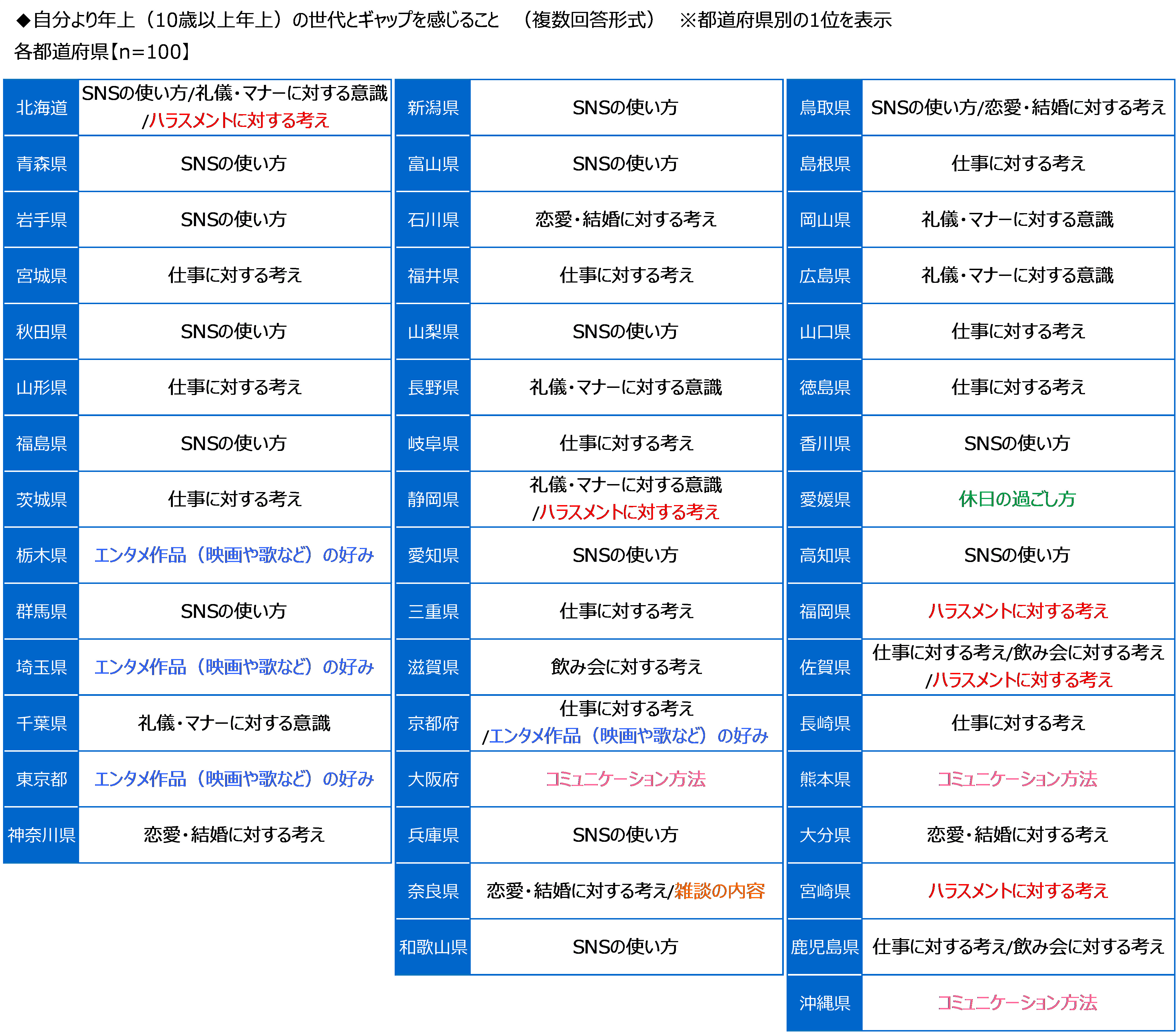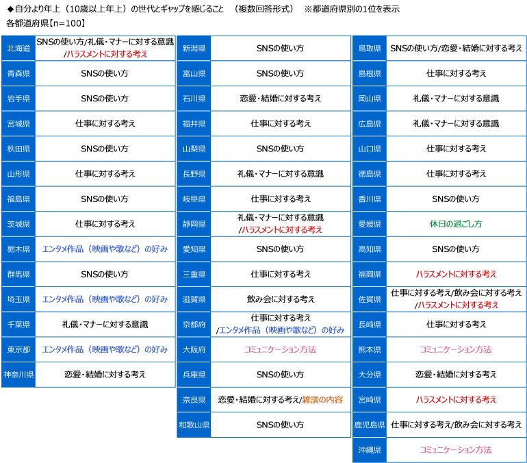 都道府県別にみると、栃木県、埼玉県、東京都、京都府では「エンタメ作品(映画や歌など)の好み」、北海道、静岡県、福岡県、佐賀県、宮崎県では「ハラスメントに対する考え」が1位に挙げられた。また、大阪府、熊本県、沖縄県では「コミュニケーション方法」、奈良県では「雑談の内容」、愛媛県では「休日の過ごし方」が1位に挙げられる結果となった。