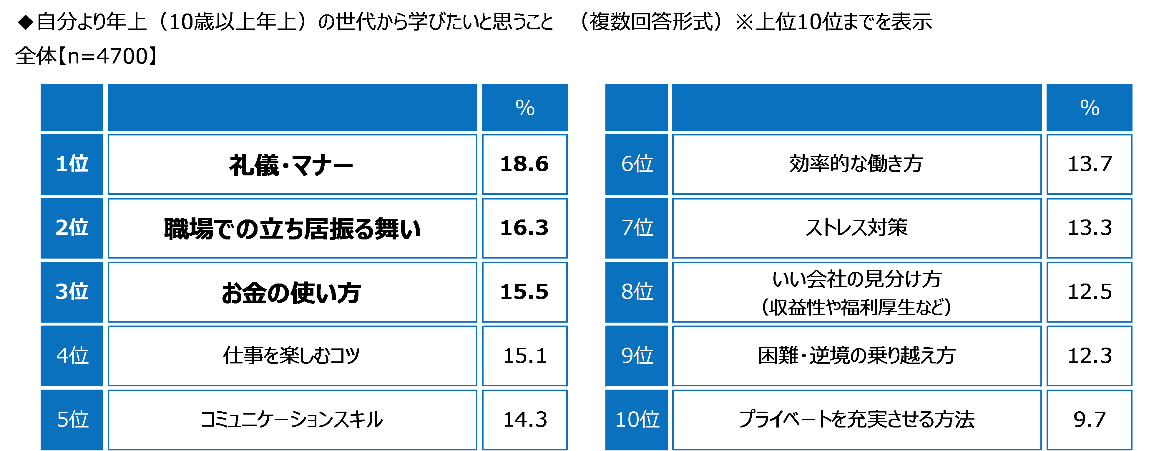 全回答者(4,700名)に、自分より年上(10歳以上年上)の世代から学びたいと思うことを聞いたところ、1位は「礼儀・マナー」(18.6%)、2位は「職場での立ち居振る舞い」(16.3%)となった。次いで、3位「お金の使い方」(15.5%)、4位「仕事を楽しむコツ」(15.1%)、5位「コミュニケーションスキル」(14.3%)となった。