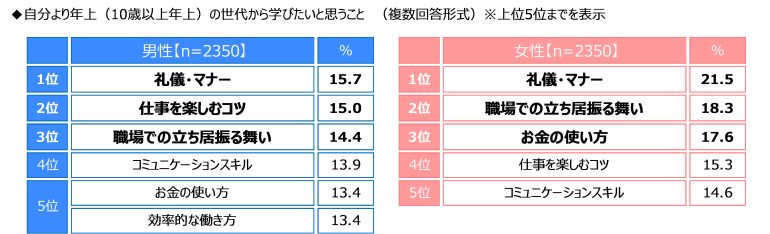 20代が年上の世代から学びたいこと 1位「礼儀・マナー」、女性では5人に1人