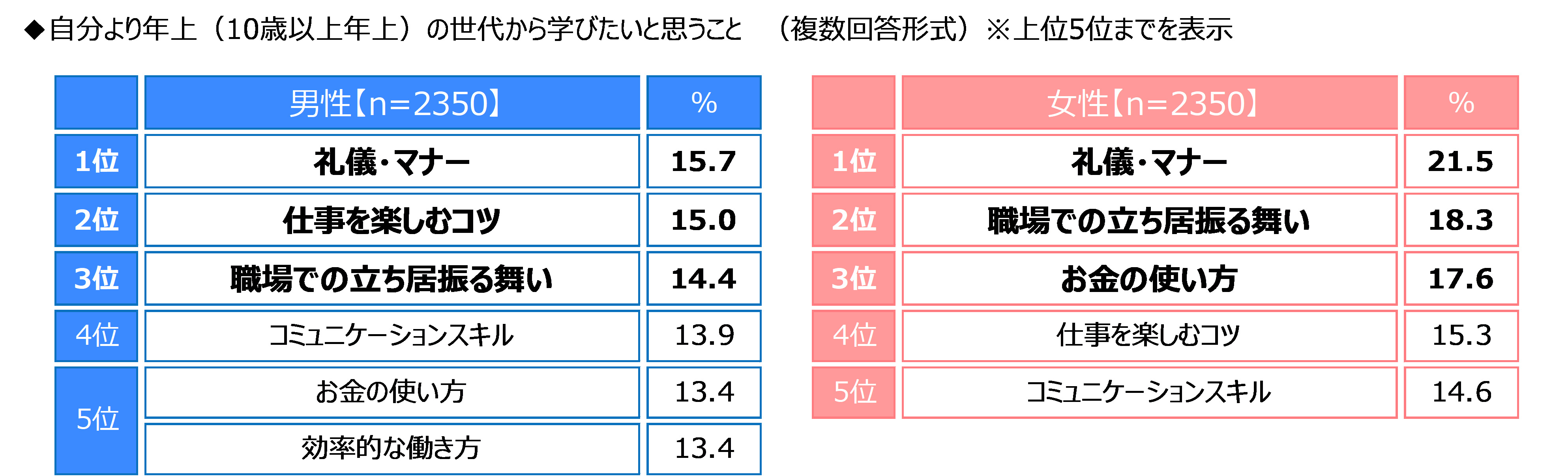 男女別にみると、1位は男性・女性ともに「礼儀・マナー」(男性15.7%、女性21.5%)となり、以降、男性では2位「仕事を楽しむコツ」(15.0%)、3位「職場での立ち居振る舞い」(14.4%)、女性では2位「職場での立ち居振る舞い」(18.3%)、3位「お金の使い方」(17.6%)が続いた。