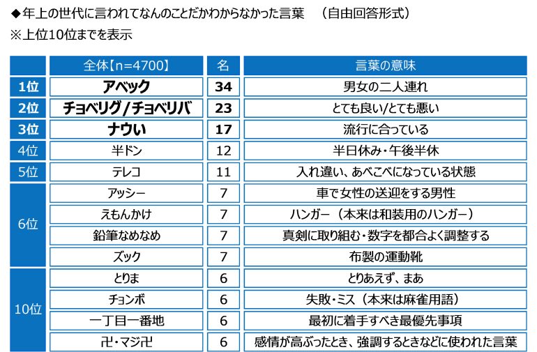 全回答者(4,700名)に、年上の世代に言われてなんのことだかわからなかった言葉を聞いたところ、1位「アベック」(34名)、2位「チョベリグ/チョベリバ」(23名)、3位「ナウい」(17名)、4位「半ドン」(12名)、5位「テレコ」(11名)となった。