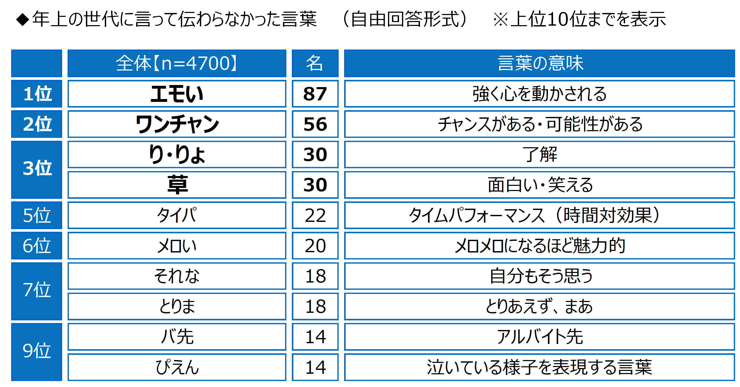 次に、年上の世代に言って伝わらなかった言葉を聞いたところ、1位「エモい」(87名)、2位「ワンチャン」(56名)、3位「り・りょ」「草」(いずれも30名)、5位「タイパ」(22名)となった。感動や懐かしさ、ときめき、切なさなど、さまざまな感情を表現する言葉である「エモい」が多く挙げられる結果となった。