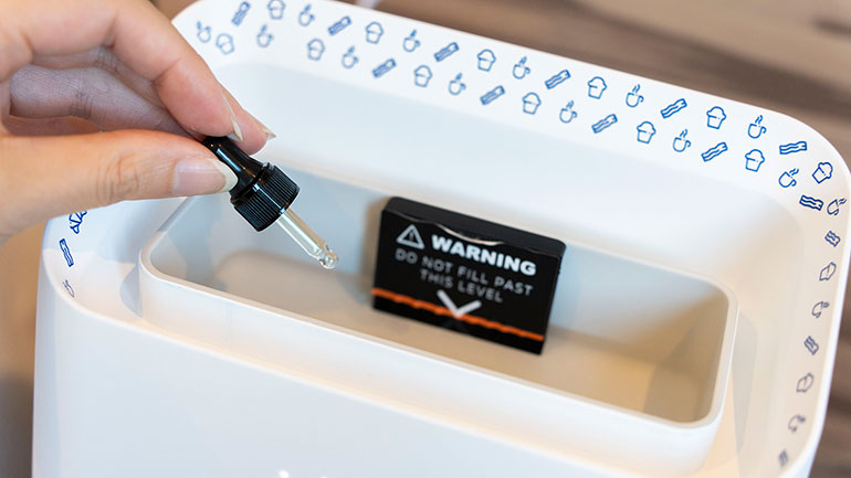 「ブレックファスト・アラームクロック」の使い方は、時計の中のタンクに水を注ぎ、好みのアロマを垂らしてからアラームを設定。そして設定した時間になると、ディフューザー式の香りアラームが起動するという仕組みだ。「香りで目覚める」がコンセプトのため、音は鳴らない。