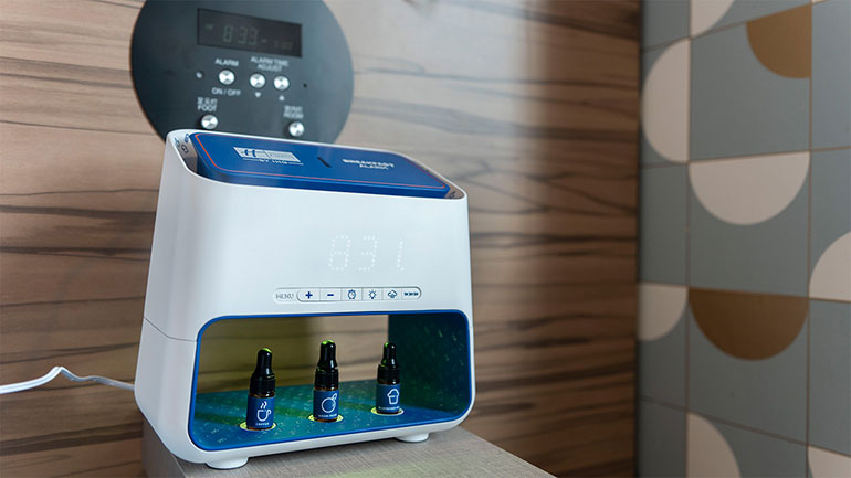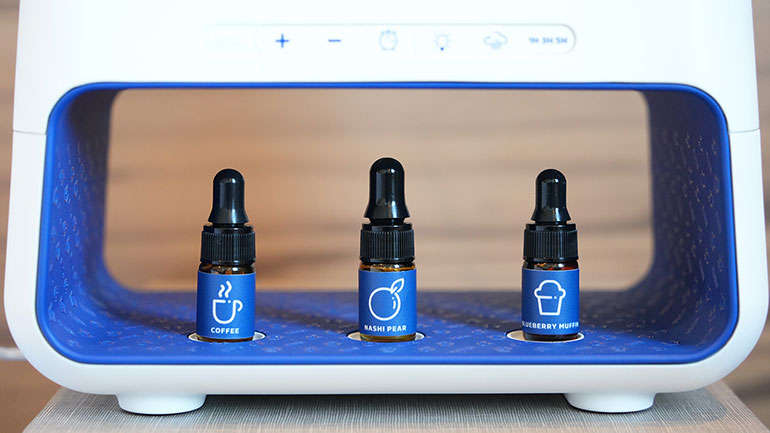 香りは3種類から選ぶことができ、ホリデイ・インエクスプレス大阪シティセンター御堂筋では「コーヒー」「梨」「ブルーベリーマフィン」の中から選択可能。これはIHGホテルズ&リゾーツが日本人に向けて行った調査の結果、「朝を良くしてくれる香りや味」として人気があったものを反映している。ちなみにオーストラリアやニュージーランドでは「ベーコン」の香りが採用されたそうだ。