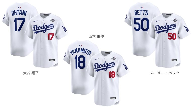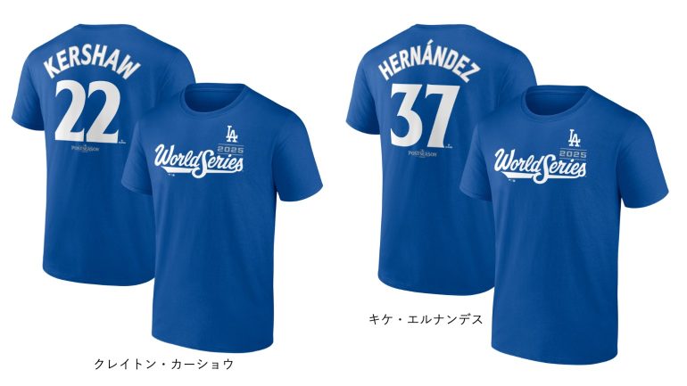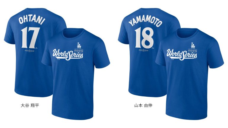 ラインアップには、ワールドシリーズ連覇を狙うドジャースと、32 年ぶりの進出を果たしたブルージェイズのワールドシリーズ2025パッチ付きリミテッドジャージをはじめ、マッチアップTシャツ、リーグ優勝記念T シャツ、ワールドシリーズ進出記念T シャツ、さらにワールドシリーズ進出に⼤きく貢献した⼤⾕翔平選⼿、⼭本由伸投⼿出場記念ネーム&ナンバーT シャツなどを展開。そのほかに雑貨類も発売予定だ。