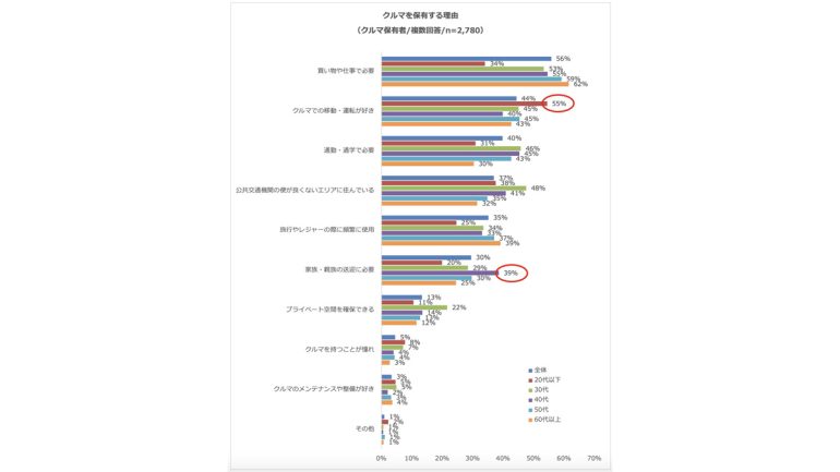 クルマを保有する理由は「買い物や仕事で必要」が全体で多く、20代以下は「クルマでの移動・運転が好き」が最多に