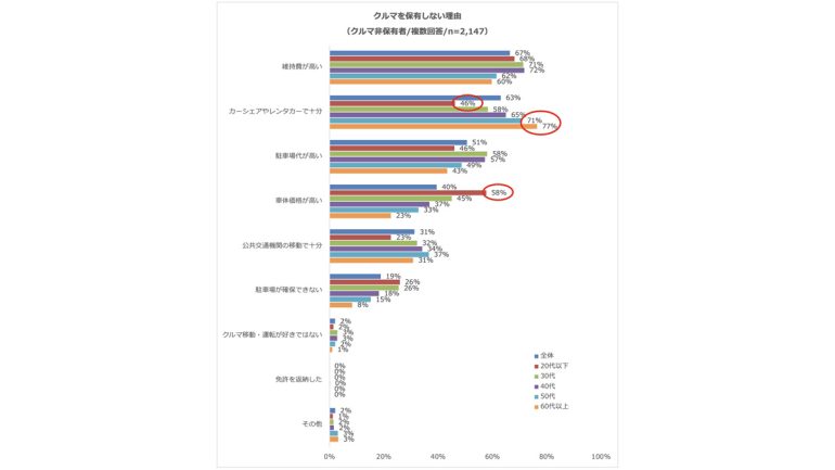 クルマを保有しない理由は「維持費が高い」が全年代で6割以上に、20代以下は「車体価格が高い」が半数超え