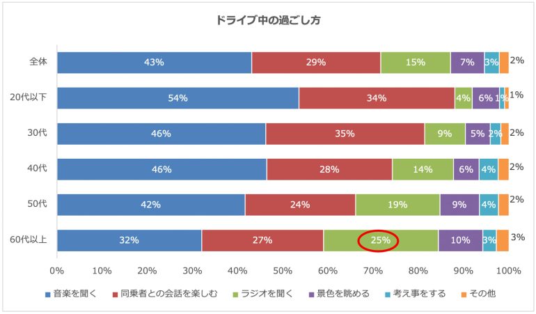 ドライブ中は音楽や同乗者との会話を楽しむ人が多く、年代が上がるほどラジオを聞く人が増える