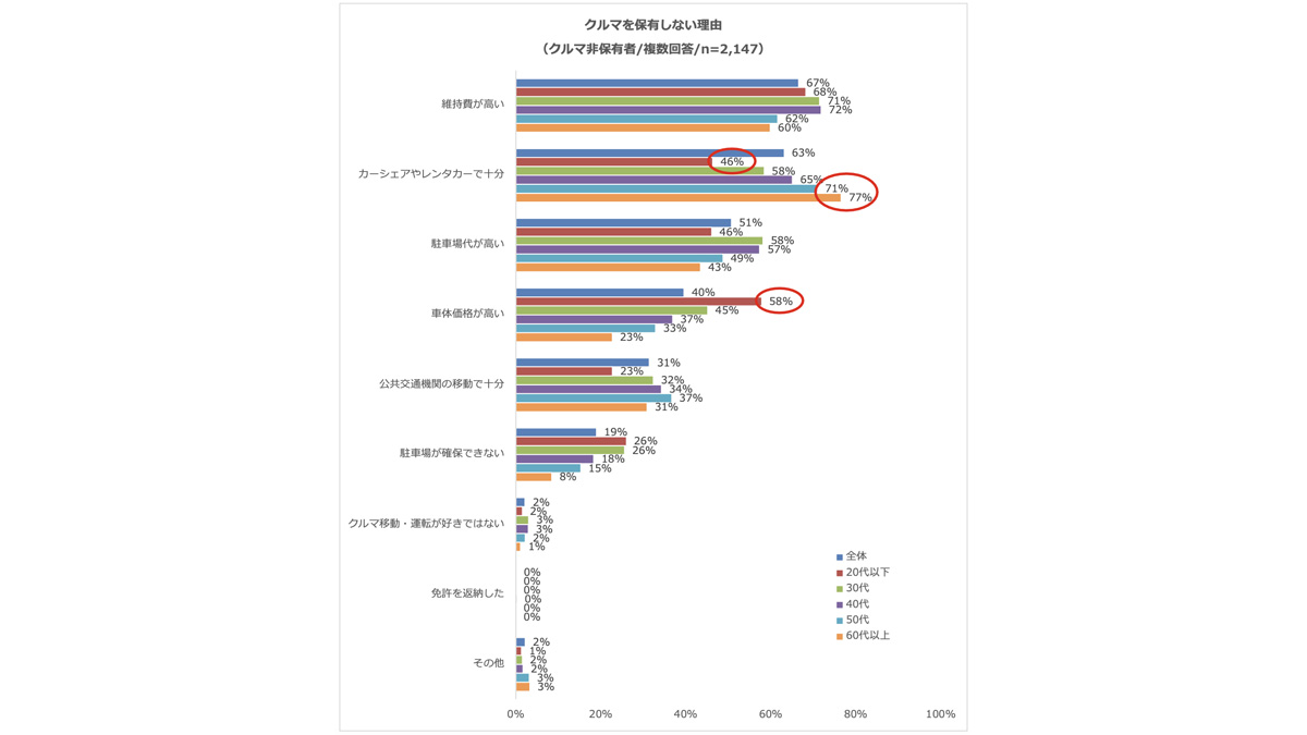 クルマを保有していない人に保有しない理由を聞くと、「維持費が高い」67%、「カーシェアやレンタカーで十分」63%が上位に並んだ。