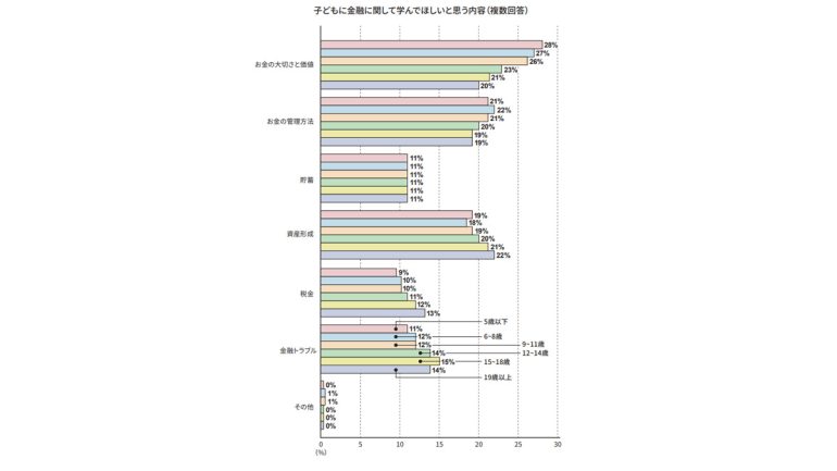 14歳までの子どもに対しては、次いで「お金の管理方法」が多く、子どもが低年齢のうちに基礎的な金融の知識として、お金の価値や管理方法を学んでほしいと思っている親が多いことがうかがえる。