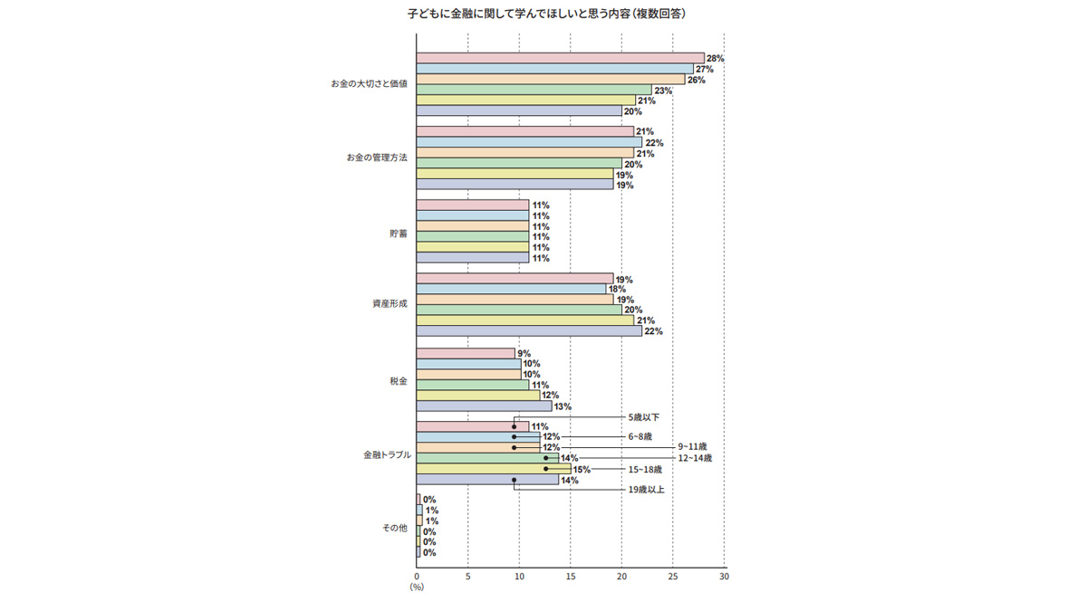 子どもに学んでほしい内容は「お金の大切さと価値」や「お金の管理方法」、年齢が高くなるほど「資産形成」や「税金」、「金融トラブル」が増加傾向