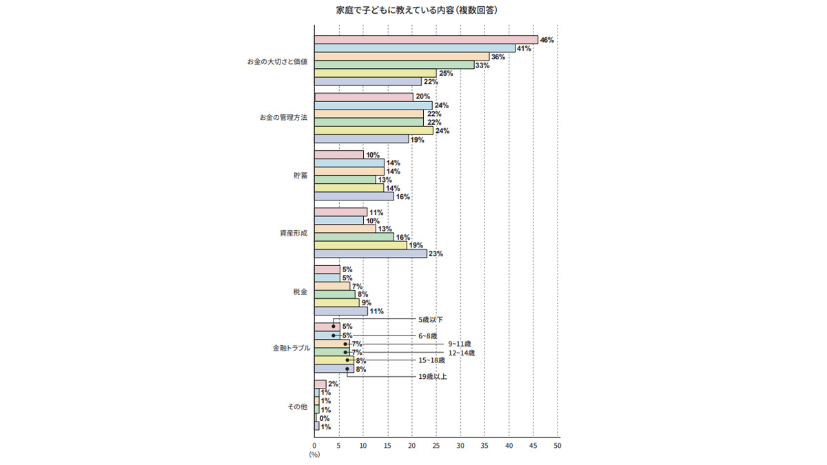 14歳までの子どもに対しては、次いで「お金の管理方法」が多く、子どもが低年齢のうちに基礎的な金融の知識として、お金の価値や管理方法を学んでほしいと思っている親が多いことがうかがえる。