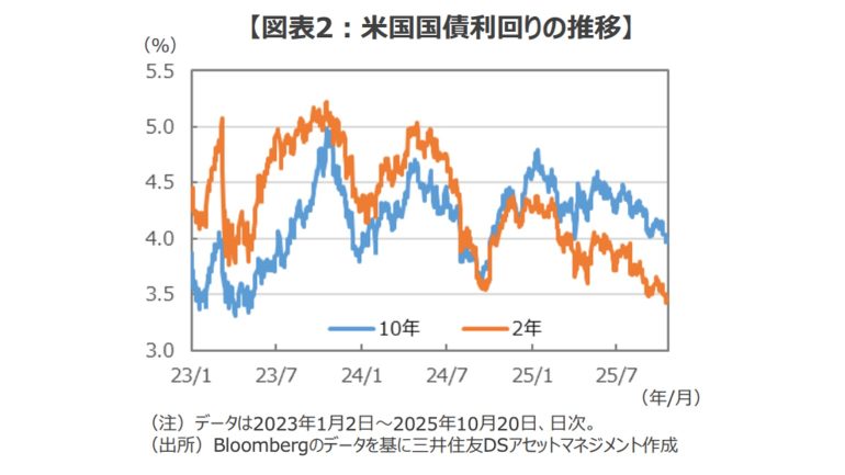 こうした環境下で、米国国債利回りは低下基調をたどっている(図表2)。もっとも、2026年に向けては、今年7月に成立した大型の減税・歳出法(OBBBA)など、拡張的な財政政策を背景に景気が持ち直す可能性があり、長期金利(10年)を中心に上昇圧力が徐々に強まる展開も想定できる。