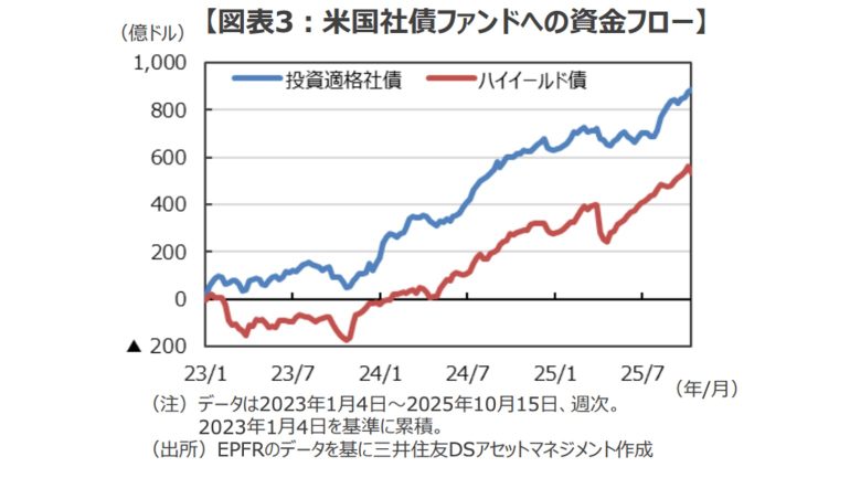 しかし、その後は関税交渉の進展を受けて、市場のリスク選好が強まり、資金流入傾向が続いている。また、投資適格社債(トリプルB格以上の高格付け社債)では、雇用市場の悪化を背景に2025年内の利下げ観測が高まった8月以降、資金流入が加速している(図表3)。