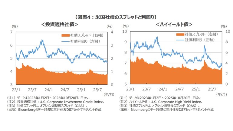 FRBが連続利下げの姿勢を示し、市場金利が低下する中、社債利回りは低下(債券価格は上昇)傾向にある。米国の社債スプレッドが歴史的な低水準にあることを考慮すると、今後は米国の金融政策や景気動向を見極めながら、対象市場や企業・業種の選別がより重要な局面を迎える可能性がありそうだ。