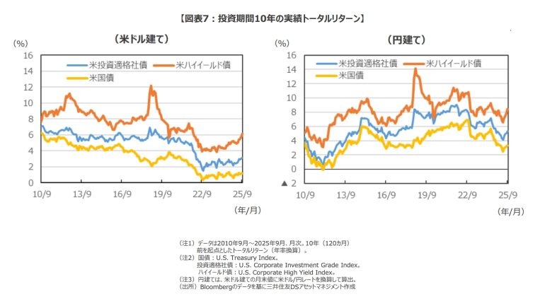 米国の投資適格社債、ハイイールド債、国債(米ドル建て)に10年間投資した場合の実績トータルリターン(図表7)を見ると、2025年9月まで10年間では、投資適格社債が年率+3.1%、ハイイールド債が同+6.2%となり、国債(同+1.2%)を上回っている。