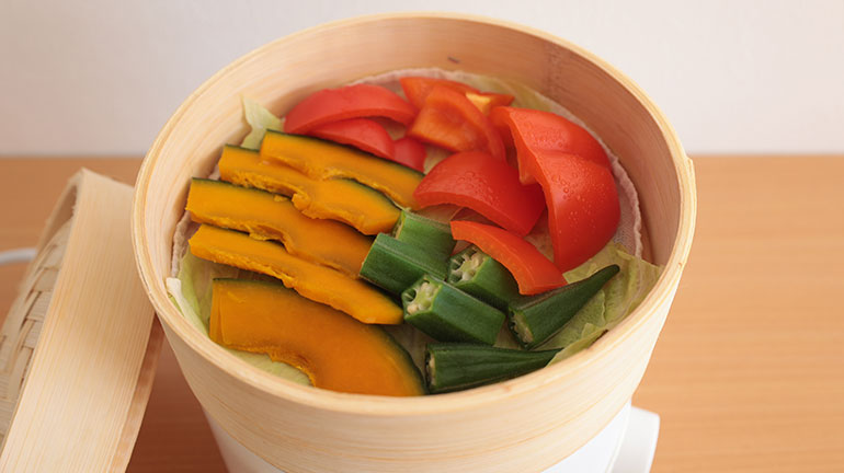 次は、蒸し野菜にチャレンジ。蒸し布とキャベツの葉を敷き、刻んだ野菜を乗せ10分加熱。蒸し布があれば、キャベツの葉はいらないと思ったが、カボチャの色が蒸し布に移るリスクを案じた。筆者はまったくのせいろ初心者だが、こちらもパーフェクトに蒸し上がった。
