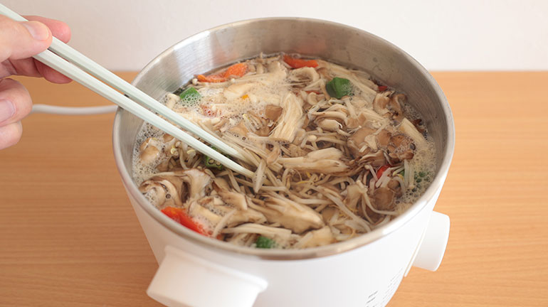 本製品の特徴として、水蒸気を発生させる鍋は、卓上鍋として単独でも使える点が挙げられる。一般的な鍋料理なら2人分つくれるそうで、試しにきのこ鍋を調理してみた。