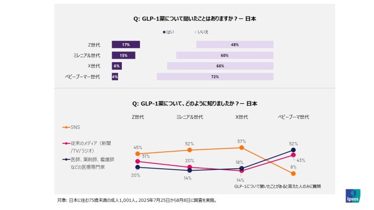 GLP-1薬に関する情報源をみると、若年層ではSNSを通じて情報を得る割合が高い一方で、年長層では医療専門家からの情報が中心となっていた。
