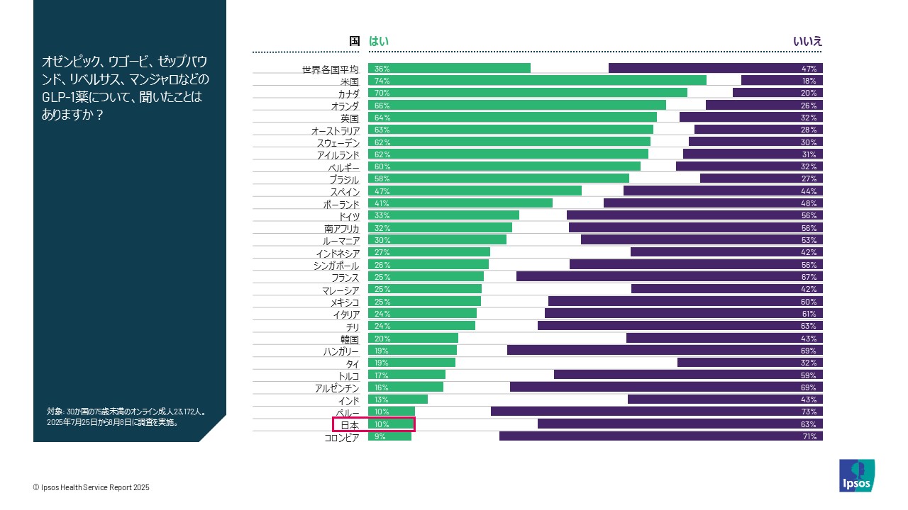 GLP-1薬、日本での認知はわずか10%で世界30か国中29位