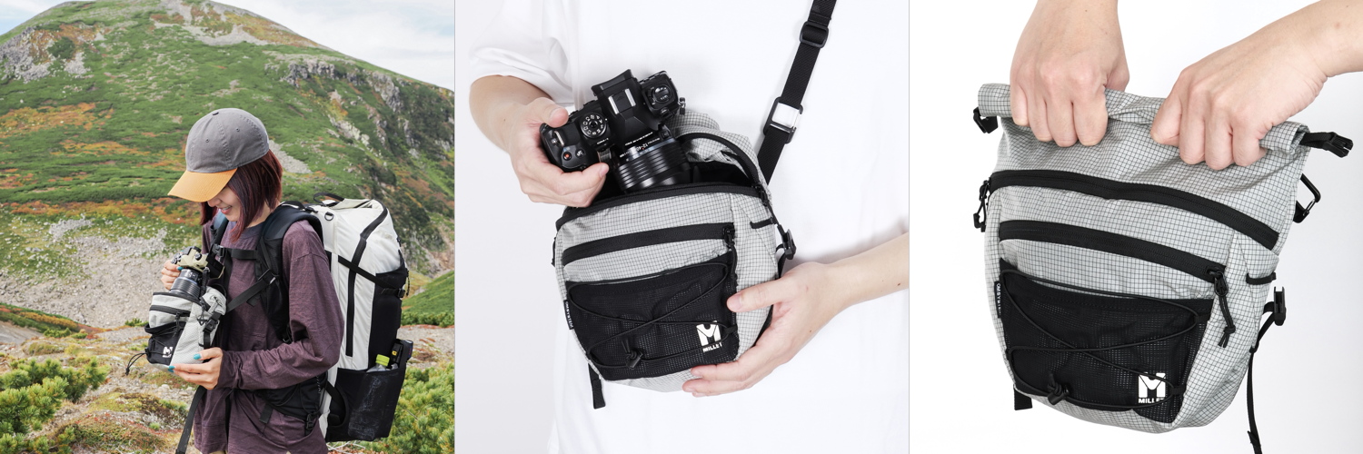 登山用バックパックとして人気のミレー「パルマラン(PARMELAN)」シリーズの軽量性、耐久性、機能性のコンセプトを受け継ぎ、小型軽量のミラーレス一眼カメラの収納に最適化した撮影と登山をひとつの冒険として楽しむ人に向けた、軽快さと機能性を兼ね備えたショルダーバッグとなっている。