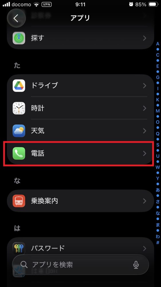 手順2:下にスクロールしていき、「アプリ」をタップ