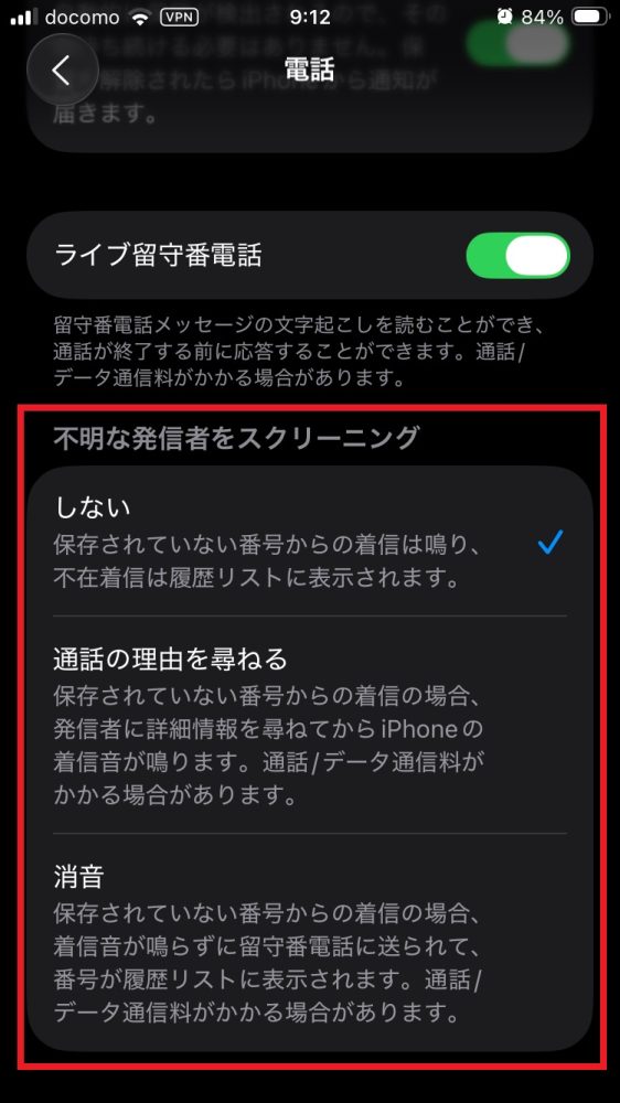 手順3:「通話をスクリーニング」ボタンをタップして有効化する