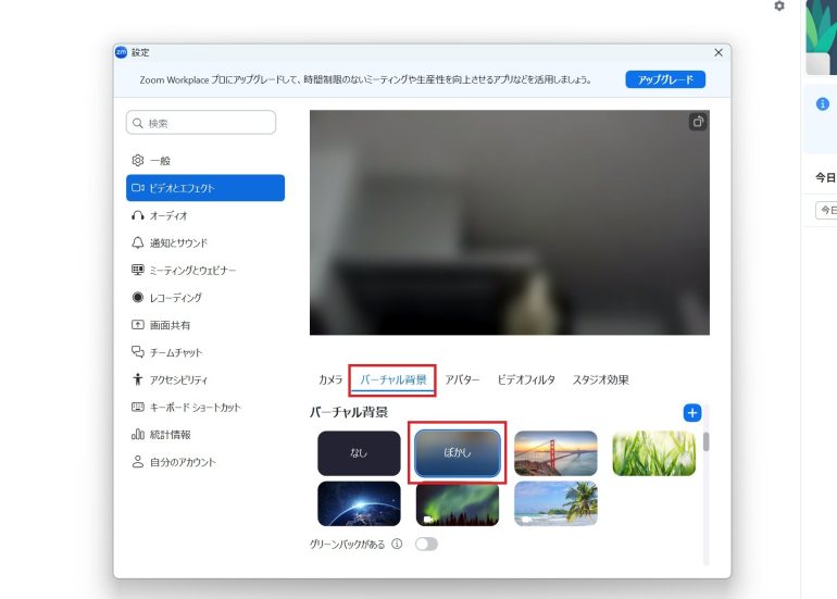 - 「バーチャル背景」内の「ぼかし」を選択する