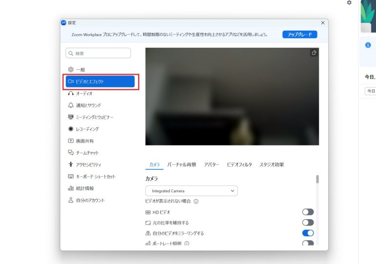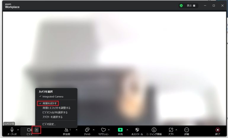 すぐに反映されない場合は、一度ミーティングに参加して確認する。ミーティング中でも、画面下の「ビデオの横にある矢印」→「背景と効果を選択」から同じ設定が可能である。