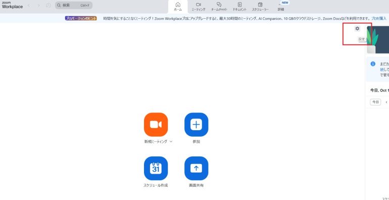 - Zoomアプリを起動し、右上の歯車アイコンから「設定」を開く