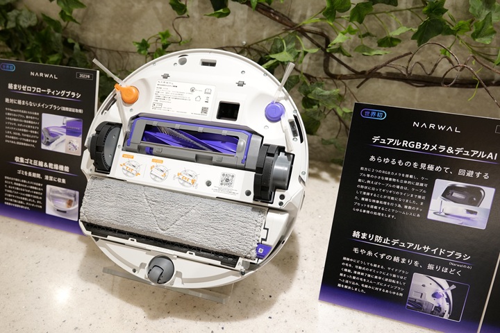 従来のローラータイプのモップの場合、フィルターやスクレーパー部分の手入れが必要になるが、「Narwal Flow」は手入れが一切不要のメンテナンスフリーという点が大きなポイントになっている。発表会では、液体汚れを清掃する動作を下から確認できるスペースが展示された。